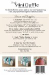 SPECIAL FEATURES: Quick project - The Mini Duffle is the perfect size to use as a purse, small tote, toiletry bag and more! French Seam Box Corners. Fat Quarter Friendly. This pattern does not include paper templates. Fabric is meant
